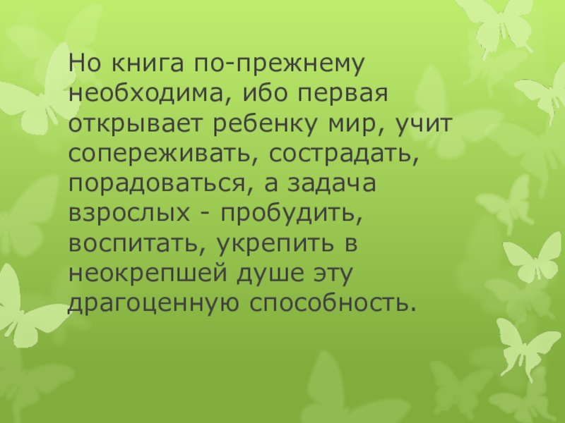 Слайд 6Но книга по-прежнему необходима, ибо первая открывает ребенку мир, учит сопереживать,