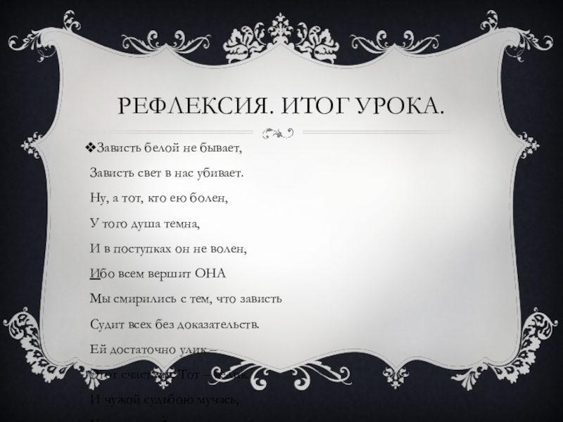 Известно, что первоначально пьеса носила название «Зависть». Исследованию и обличению этого порока она и была посвящена.