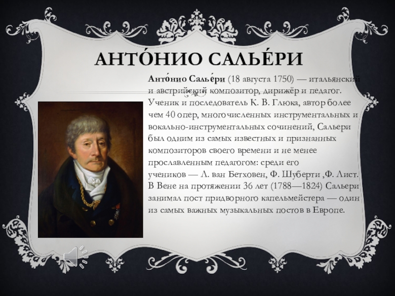 Анто́нио Салье́ри (18 августа 1750) — итальянский и австрийский композитор, дирижёр и