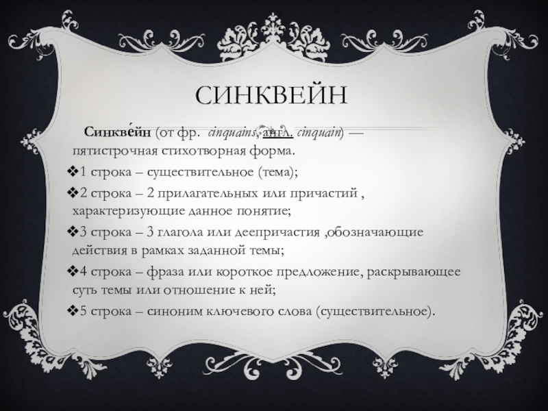 Синкве́йн (от фр. cinquains, англ. cinquain) — пятистрочная стихотворная форма.