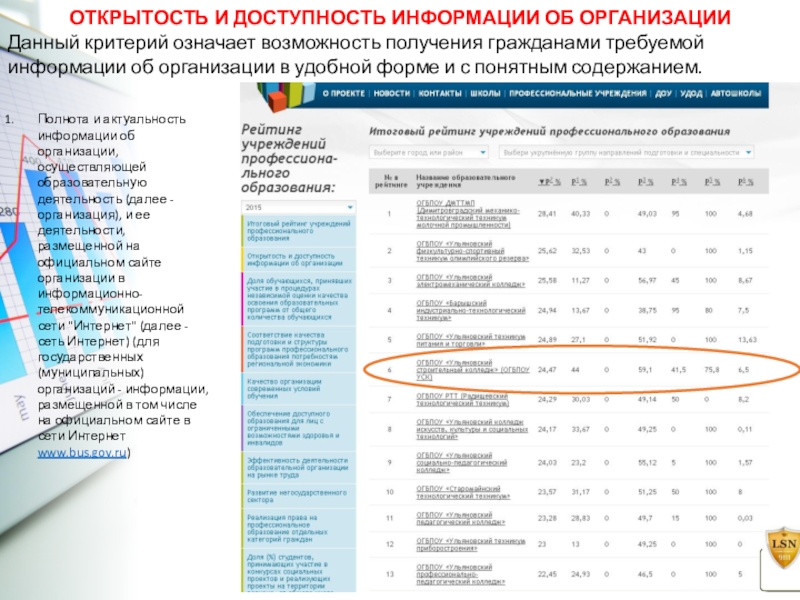 Полнота и актуальность информации об организации, осуществляющей образовательную деятельность (далее - организация), и ее деятельности, размещенной на официальном сайте организации в информационно-телекоммуникационной сети "Интернет" (далее - сеть Интернет) (для государственных (муниципальных) организаций - информации, размещенной в том числе на официальном сайте в сети Интернет www.bus.gov.ru)