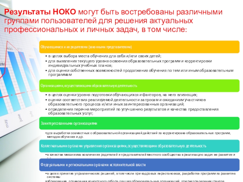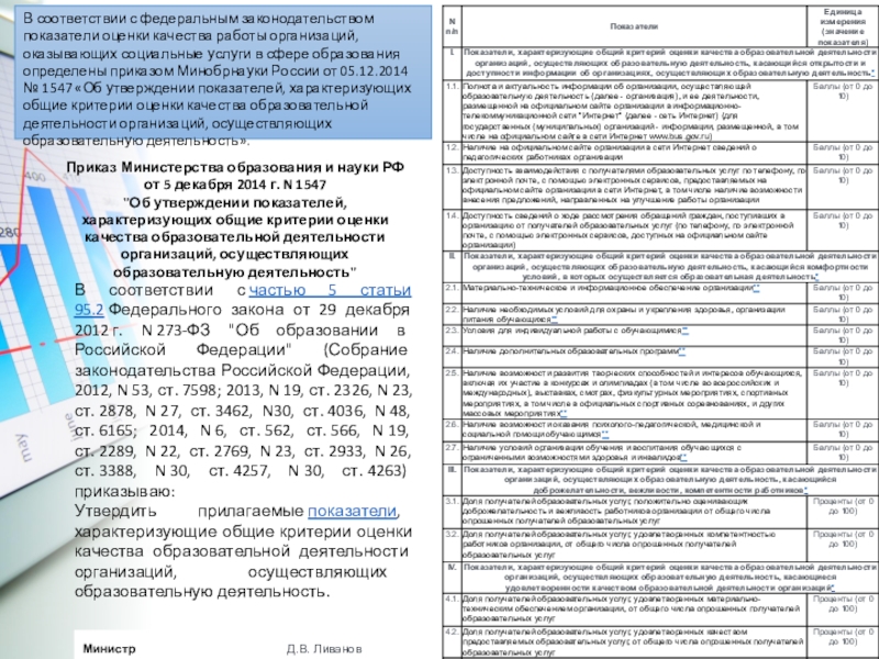В соответствии с федеральным законодательством показатели оценки качества работы организаций, оказывающих социальные услуги в сфере образования определены приказом Минобрнауки России от 05.12.2014 № 1547 «Об утверждении показателей, характеризующих общие критерии оценки качества образовательной деятельности организаций, осуществляющих образовательную деятельность».
