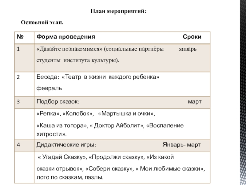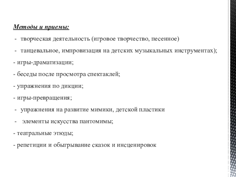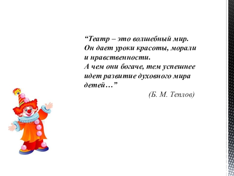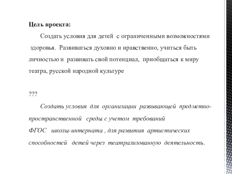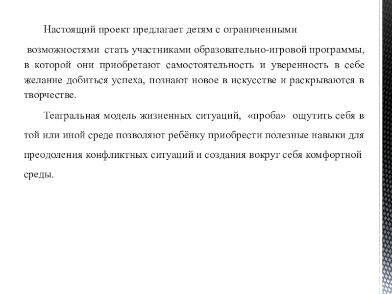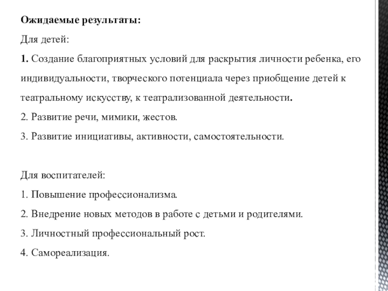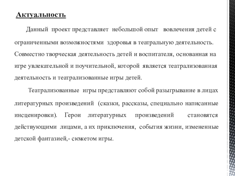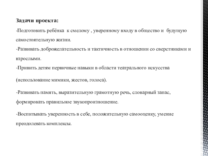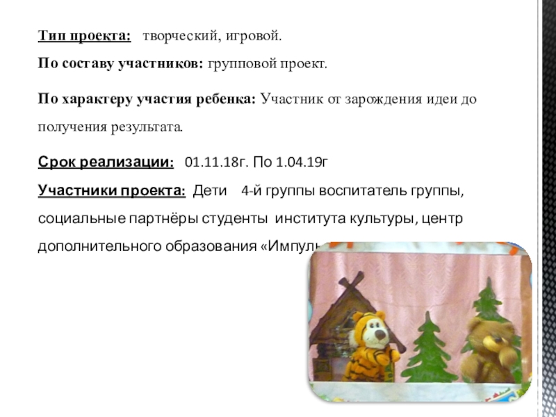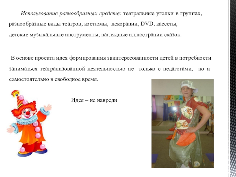 В основе проекта идея формирования заинтересованности детей в потребности заниматься театрализованной деятельностью не только с педагогами, но и самостоятельно в свободное время.