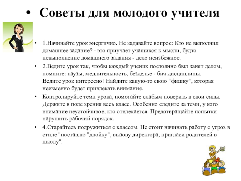 Контролируйте темп урока, помогайте слабым поверить в свои силы. Держите в поле зрения весь класс. Особенно следите за теми, у кого внимание неустойчивое, кто отвлекается. Предотвращайте попытки нарушить рабочий порядок.