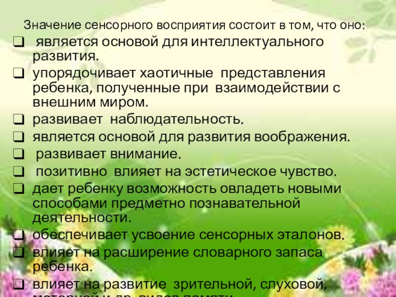 невозможно нормальное формирование умственных способностей ребенка. Этот период важен для совершенствования деятельности органов чувств, накопления представлений об окружающем мире, распознания творческих способностей. Каждый человек , только появившись на свет, уже готов к восприятию окружающего мира: он способен видеть, слышать, чувствовать тепло и холод и т.п. Сенсорная культура обеспечивает полноценное восприятие окружающего мира, что способствует умственному, физическому, эстетическому развитию детей.
