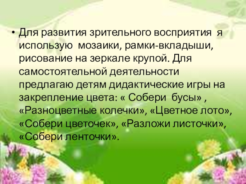 Для развития зрительного восприятия я использую мозаики, рамки-вкладыши, рисование на зеркале