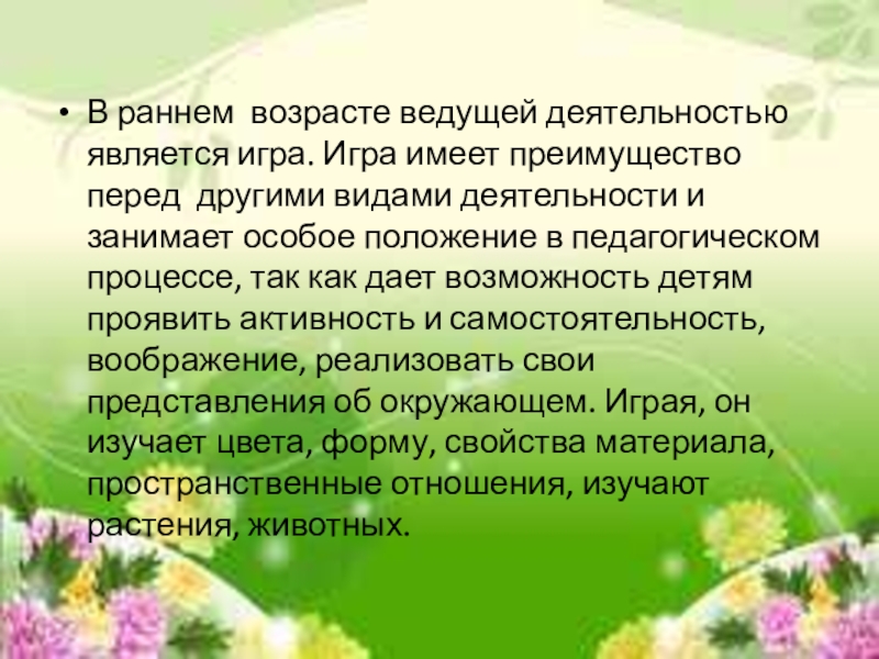 Слайд 6В раннем возрасте ведущей деятельностью является игра. Игра имеет преимущество перед