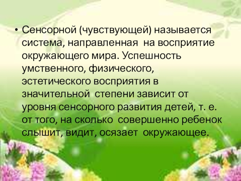 Слайд 3Сенсорной (чувствующей) называется система, направленная на восприятие окружающего мира. Успешность умственного,