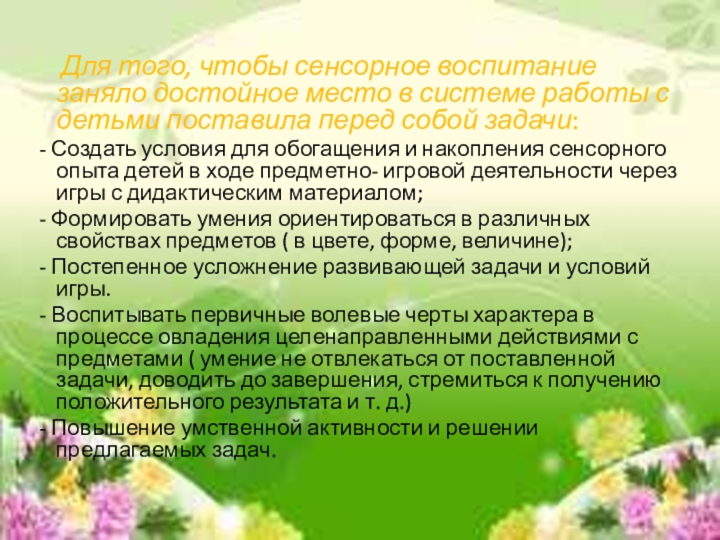 Слайд 4 Для того, чтобы сенсорное воспитание заняло достойное место