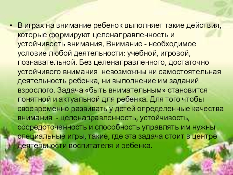 Слайд 7В играх на внимание ребенок выполняет такие действия, которые формируют целенаправленность