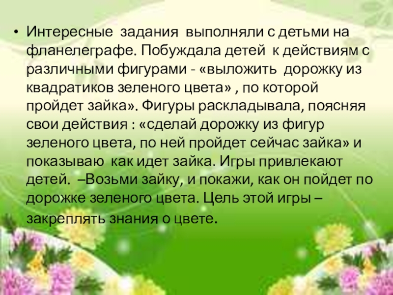 Слайд 25Интересные задания выполняли с детьми на фланелеграфе. Побуждала детей к действиям