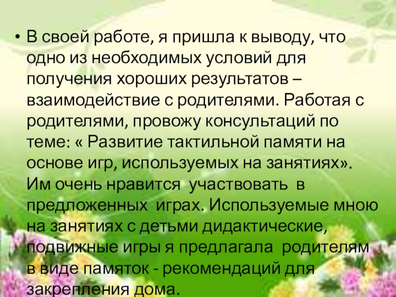 условий для получения хороших результатов – взаимодействие с родителями. Работая с родителями, провожу консультаций по теме: « Развитие тактильной памяти на основе игр, используемых на занятиях». Им очень нравится участвовать в предложенных играх. Используемые мною на занятиях с детьми дидактические, подвижные игры я предлагала родителям в виде памяток - рекомендаций для закрепления дома.