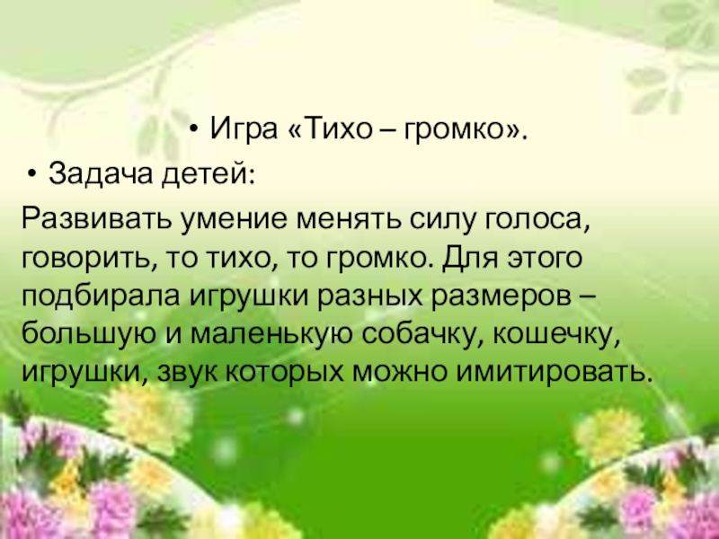 говорить, то тихо, то громко. Для этого подбирала игрушки разных размеров – большую и маленькую собачку, кошечку, игрушки, звук которых можно имитировать.