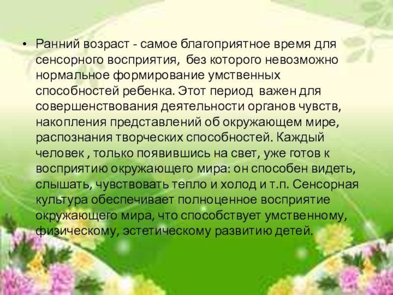 Слайд 2Ранний возраст - самое благоприятное время для сенсорного восприятия, без которого