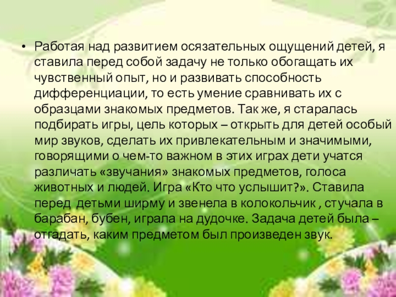 Слайд 29Работая над развитием осязательных ощущений детей, я ставила перед собой задачу