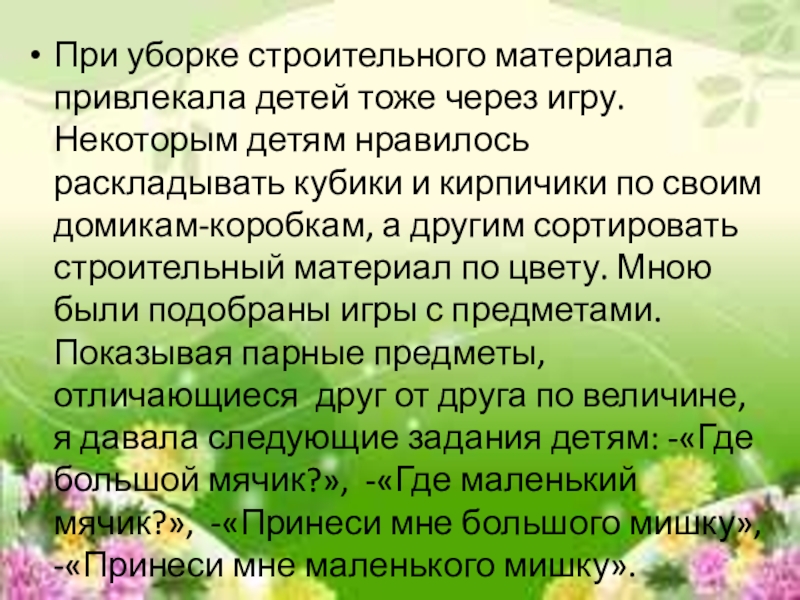 Слайд 27При уборке строительного материала привлекала детей тоже через игру. Некоторым детям