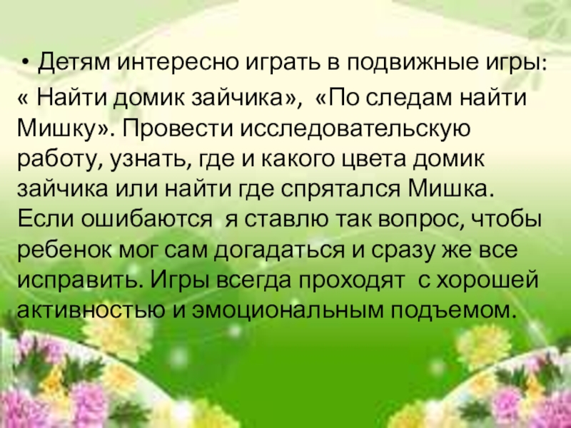следам найти Мишку». Провести исследовательскую работу, узнать, где и какого цвета домик зайчика или найти где спрятался Мишка. Если ошибаются я ставлю так вопрос, чтобы ребенок мог сам догадаться и сразу же все исправить. Игры всегда проходят с хорошей активностью и эмоциональным подъемом.