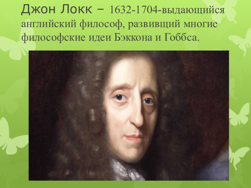 Слайд 2Джон Локк – 1632-1704-выдающийся английский философ, развивщий многие философские идеи Бэккона