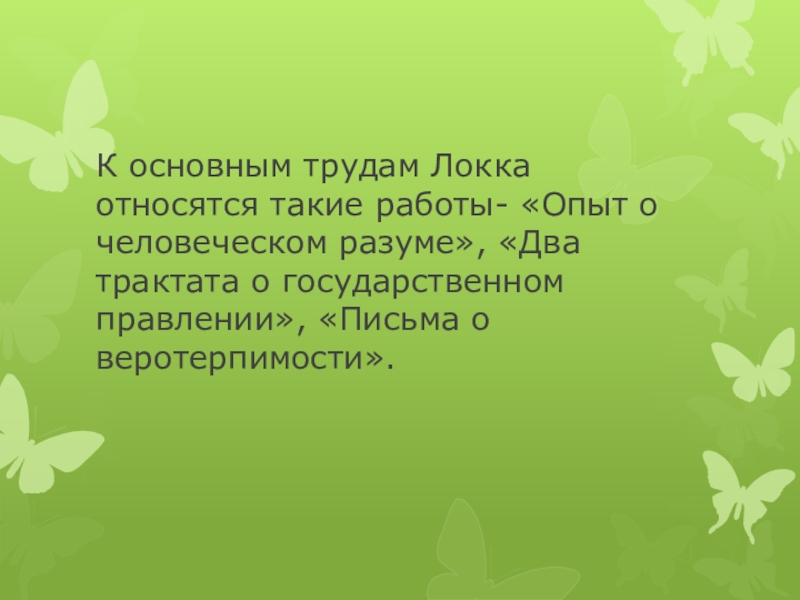 Слайд 3К основным трудам Локка относятся такие работы- «Опыт о человеческом разуме»,