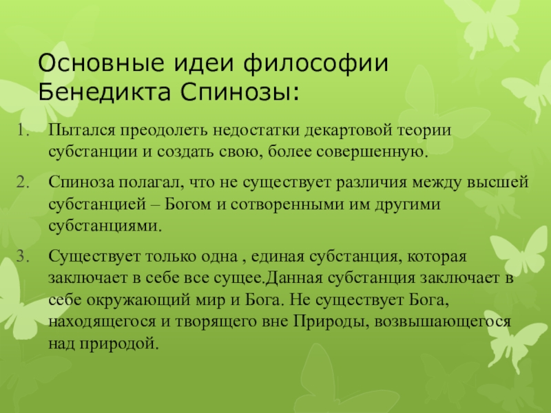 Слайд 7Основные идеи философии Бенедикта Спинозы: