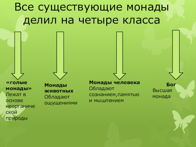 -монада, проста, неделима, не имеет протяжения, не является вещественно- материальным образованием; обладает четырьмя качествами: стремлением, влечением, восприятием и представлением;