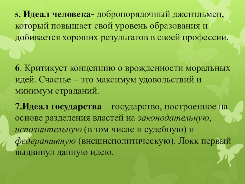 6. Критикует концепцию о врожденности моральных идей. Счастье – это максимум удовольствий и минимум страданий.