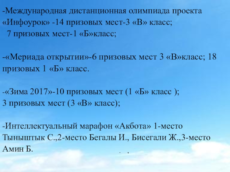 -Международный дистанционная олимпиада «Зима 2017» -2 призовых мест-учащиеся 8,9-х классов;