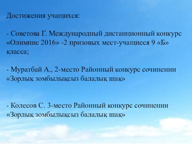 -Танатова Р.,Жетибаева Г., Орысбай Б. 1-место республиканский конкурсэссе «Великий учитель-пример для подражания» посвященный к 25-летию Независимости РК.