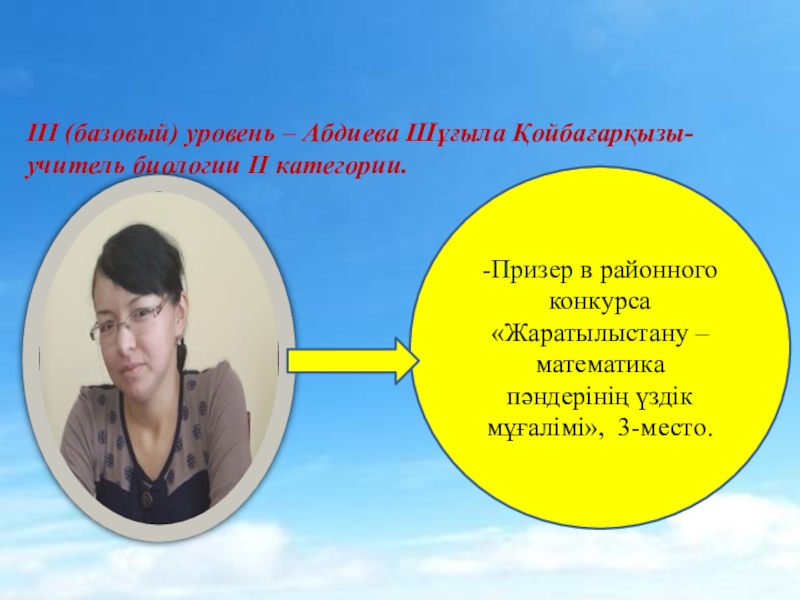 ІІІ (базовый) уровень – Абдиева Шұғыла Қойбағарқызы-учитель биологии ІІ категории.