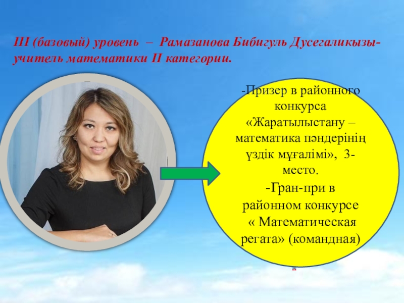 ІІІ (базовый) уровень – Рамазанова Бибигуль Дусегаликызы-учитель математики ІІ категории.