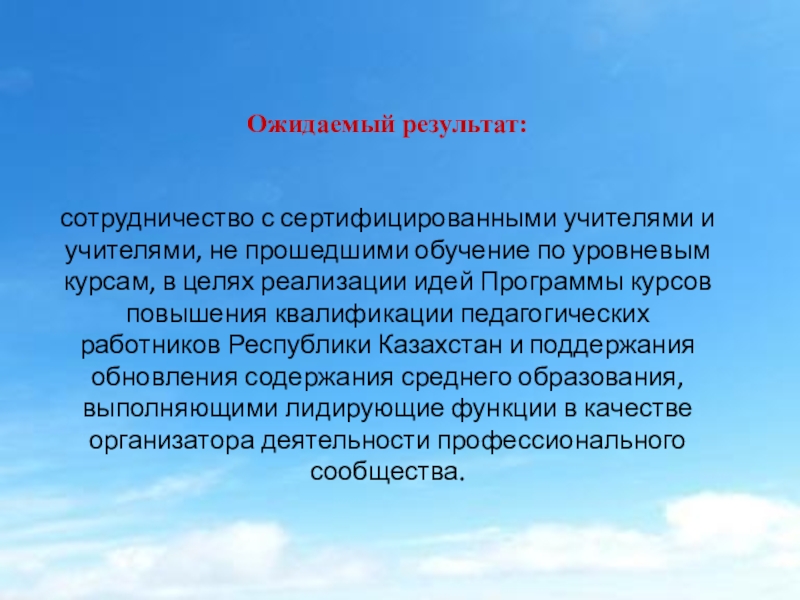 уровневым курсам, в целях реализации идей Программы курсов повышения квалификации педагогических работников Республики Казахстан и поддержания обновления содержания среднего образования, выполняющими лидирующие функции в качестве организатора деятельности профессионального сообщества.