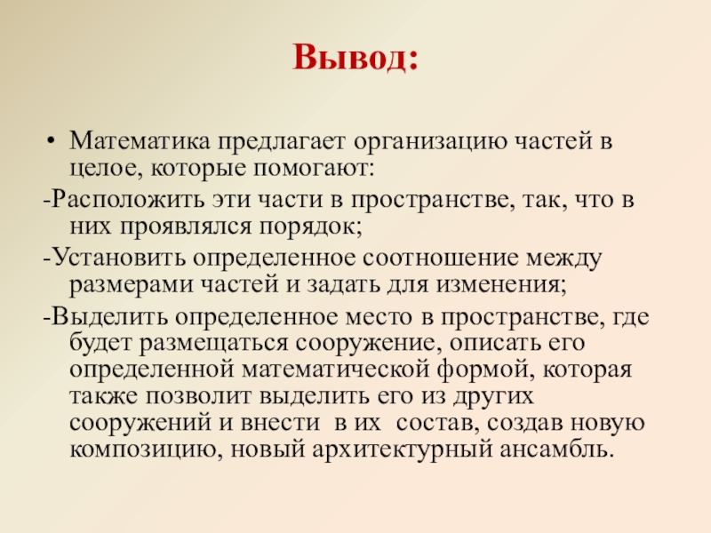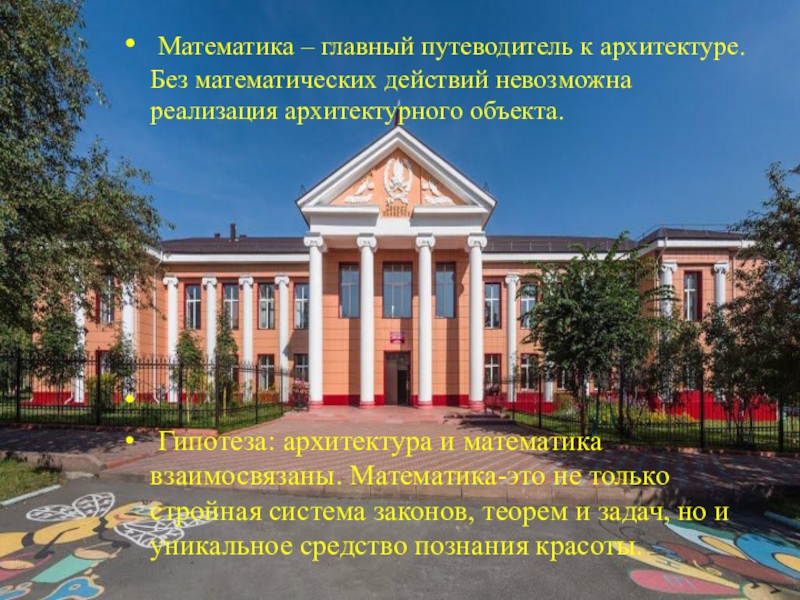 Гипотеза: архитектура и математика взаимосвязаны. Математика-это не только стройная система законов, теорем и задач, но и уникальное средство познания красоты.