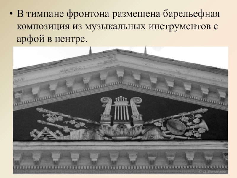 Слайд 11В тимпане фронтона размещена барельефная композиция из музыкальных инструментов с арфой