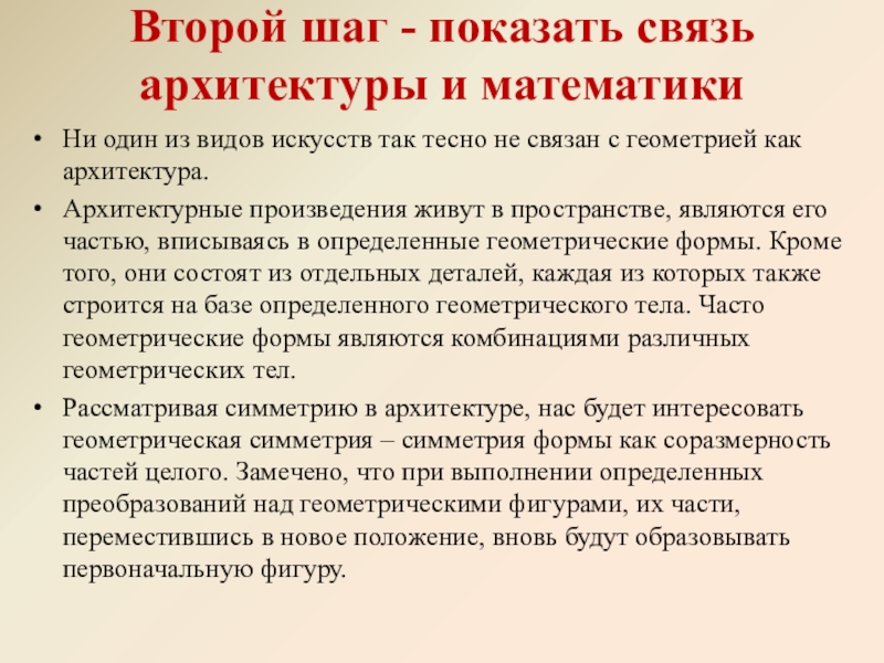 Слайд 13Второй шаг - показать связь архитектуры и математики