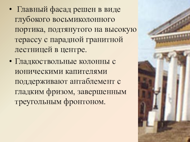 Слайд 10 Главный фасад решен в виде глубокого восьмиколонного портика, подтянутого на