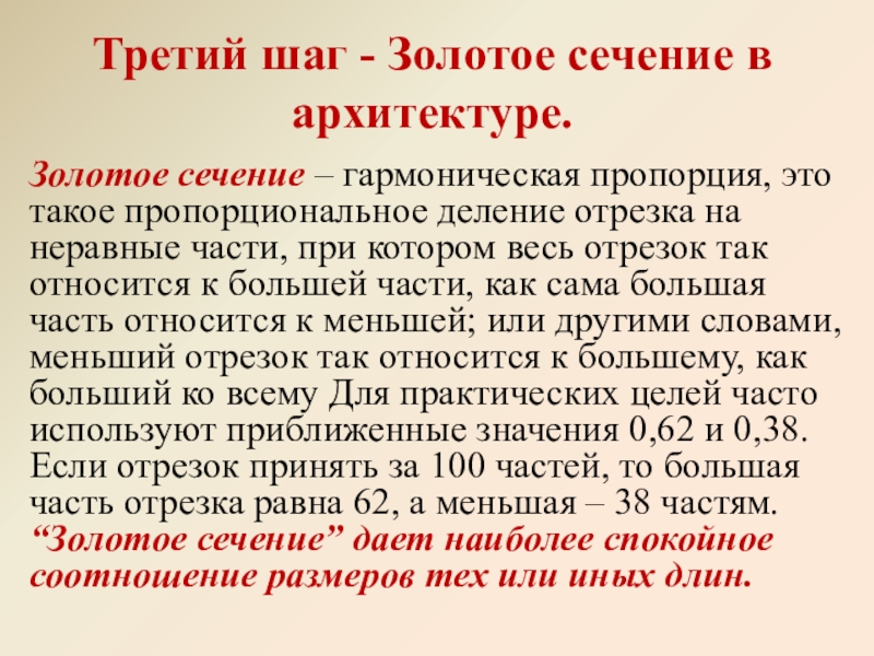 это такое пропорциональное деление отрезка на неравные части, при котором весь отрезок так относится к большей части, как сама большая часть относится к меньшей; или другими словами, меньший отрезок так относится к большему, как больший ко всему Для практических целей часто используют приближенные значения 0,62 и 0,38. Если отрезок принять за 100 частей, то большая часть отрезка равна 62, а меньшая – 38 частям. “Золотое сечение” дает наиболее спокойное соотношение размеров тех или иных длин.