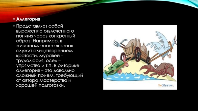 эпосе ягненок служит олицетворением кротости, муравей – трудолюбия, осел – упрямства и т.п. В риторике аллегория – это довольно сложный прием, требующий от автора мастерства и хорошей подготовки.