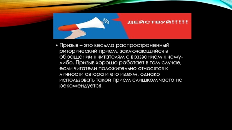 Слайд 9Призыв – это весьма распространенный риторический прием, заключающийся в обращении к