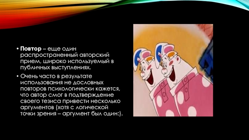 Слайд 6Повтор – еще один распространенный авторский прием, широко используемый в публичных