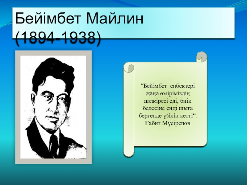Бейімбет Майлин (1894-1938)“Бейімбет еңбектері жаңа өміріміздің шежіресі еді, биік белесіне енді шыға бергенде үзіліп кетті“. Ғабит Мүсірепов