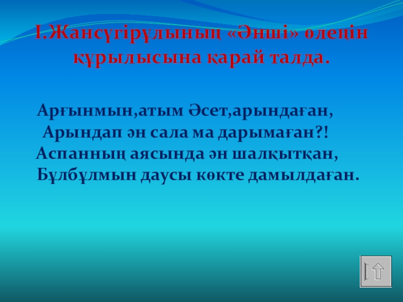 І.Жансүгірұлының «Әнші» өлеңінқұрылысына қарай талда.Арғынмын,атым Әсет,арындаған,Арындап ән сала ма дарымаған?!  Аспанның аясында ән шалқытқан,