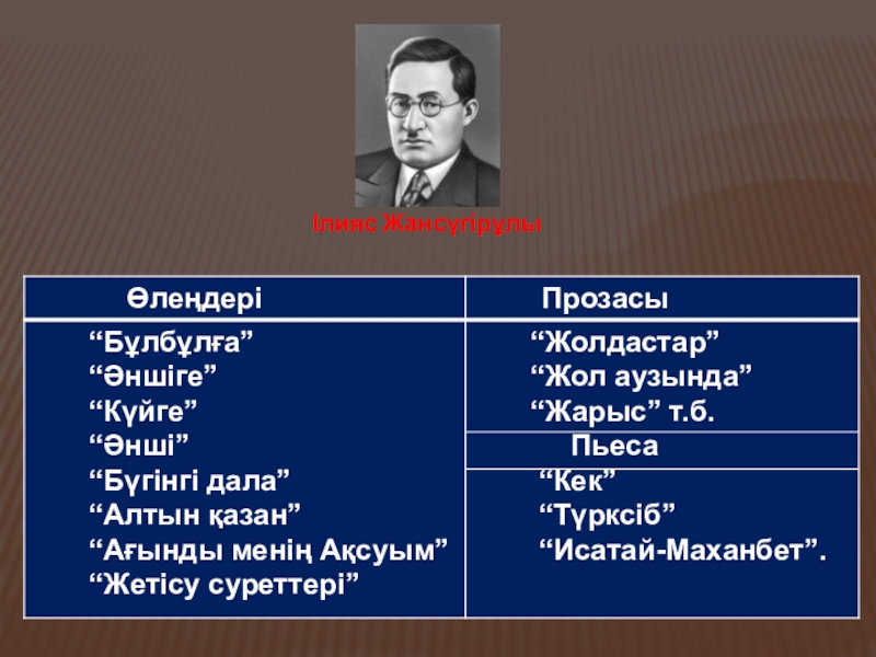 Ілияс Жансүгіров (1884-1938)“Ілияс Жансүгіровтің ірі поэмалары – “Дала”,”Күйші”, “Құлагер”. Осы үш поэма тұсында қазақтың Абайдан кейінгі поэзиясы