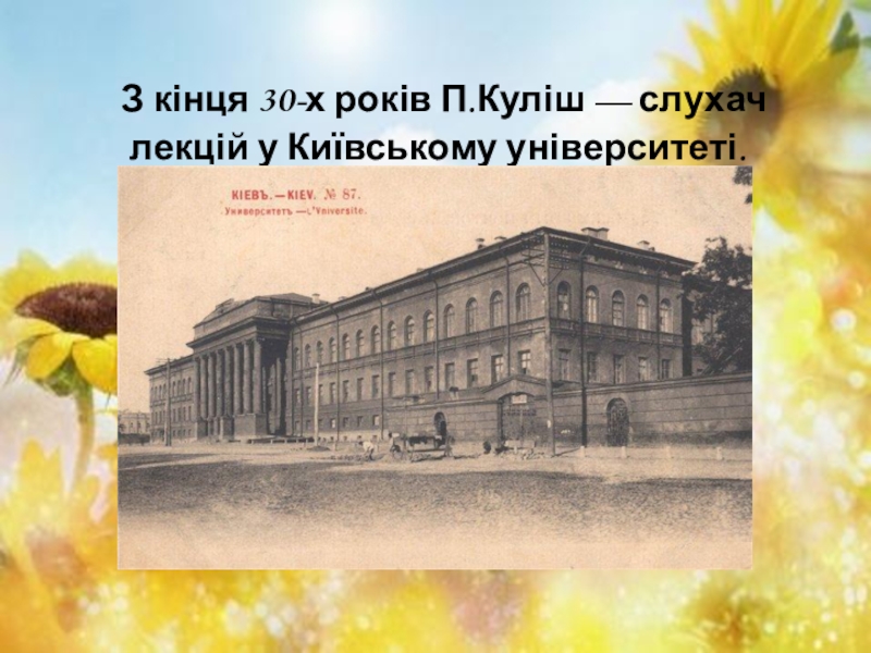З кінця 30-х років П.Куліш — слухач лекцій у Київському університеті.