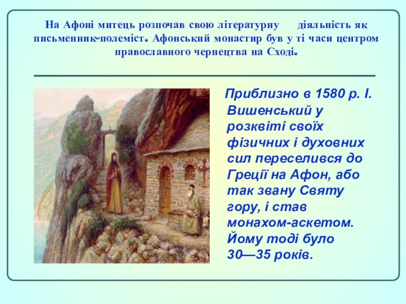 Приблизно в 1580 р. І. Вишенський у розквіті своїх фізичних і духовних сил переселився до Греції на Афон, або так звану Святу гору, і став монахом-аскетом. Йому тоді було 30—35 років.