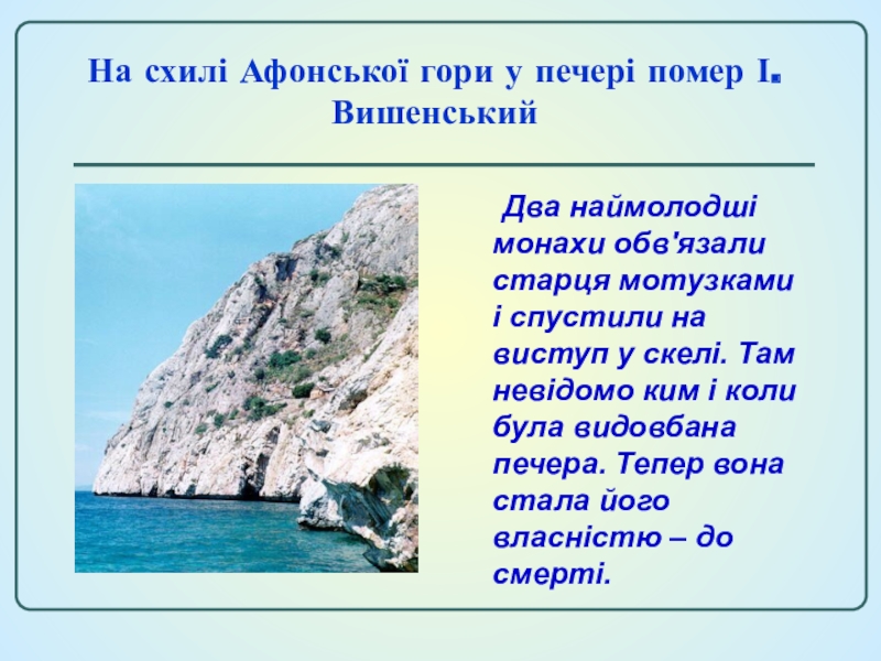 Слайд 20На схилі Афонської гори у печері помер І.Вишенський