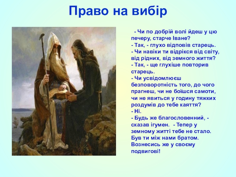 - Будь же благословенний, - сказав ігумен. - Тепер у земному житті тебе не стало. Був ти між нами братом. Вознесись же у своєму подвигові!