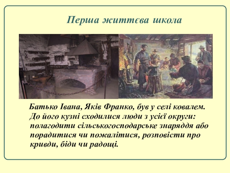 у селі ковалем. До його кузні сходилися люди з усієї округи: полагодити сільськогосподарське знаряддя або порадитися чи пожалітися, розповісти про кривди, біди чи радощі.
