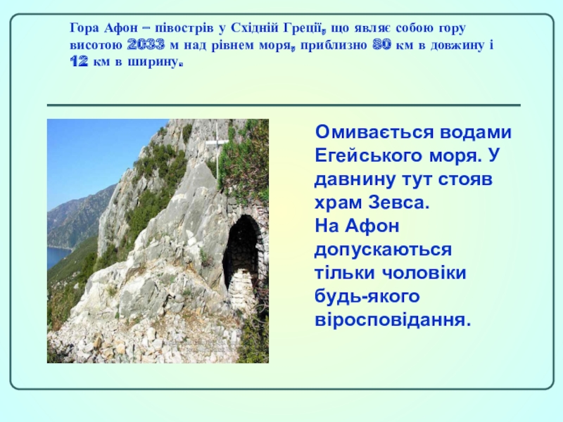 Слайд 17Гора Афон – півострів у Східній Греції, що являє собою гору