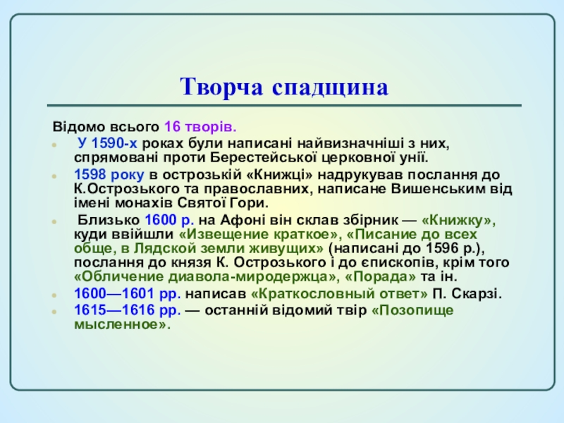1598 року в острозькій «Книжці» надрукував послання до К.Острозького та православних, написане Вишенським від імені монахів Святої Гори.