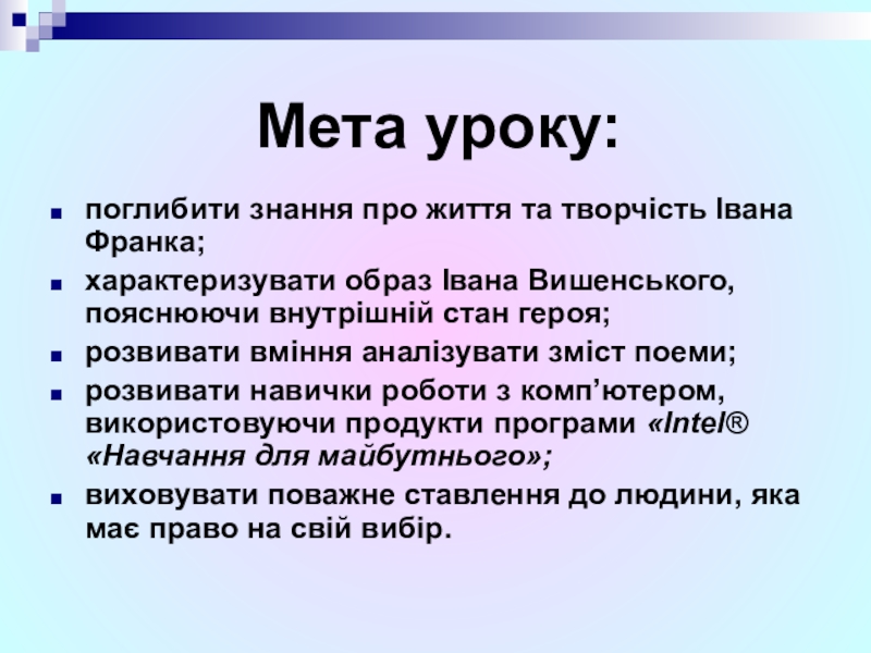 розвивати навички роботи з комп’ютером, використовуючи продукти програми «Іntel® «Навчання для майбутнього»;